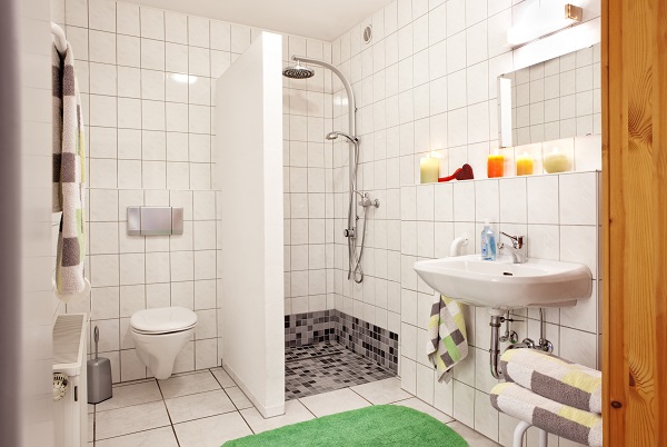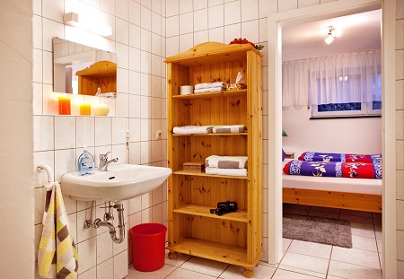 Das Badezimmer ist sowohl vom Wohnzimmer als auch vom separaten Schlafzimmer aus zu erreichen.